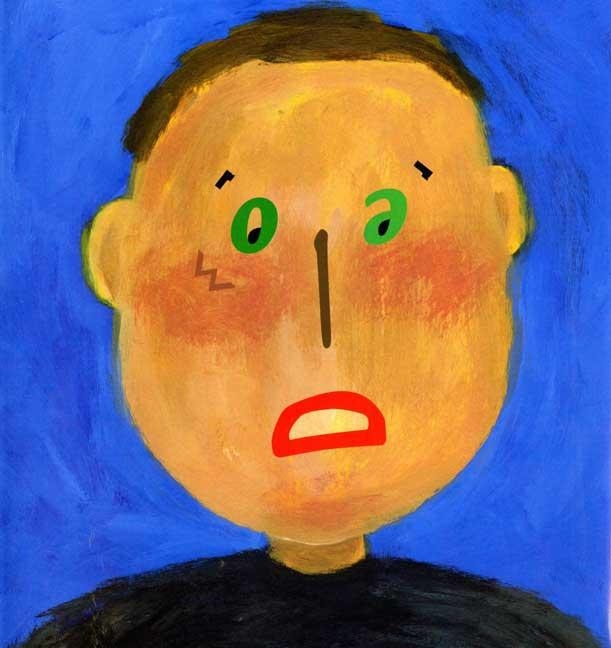 Opposite the simple declarative sentence, Walter was worried is a portrait of a very worried Walter. But wait The letters that spell out his feelings form his facial characteristics, as well as his expression. Gradually a simple story unfolds: the sky grows dark, the fog rolls in, lightning lights the sky, and thunder shakes the trees; Priscilla was puzzled, Shirley was shocked, Frederick was frightened… and eventually (when the sun came out) Henry was hopeful, and Elliot ecstatic.